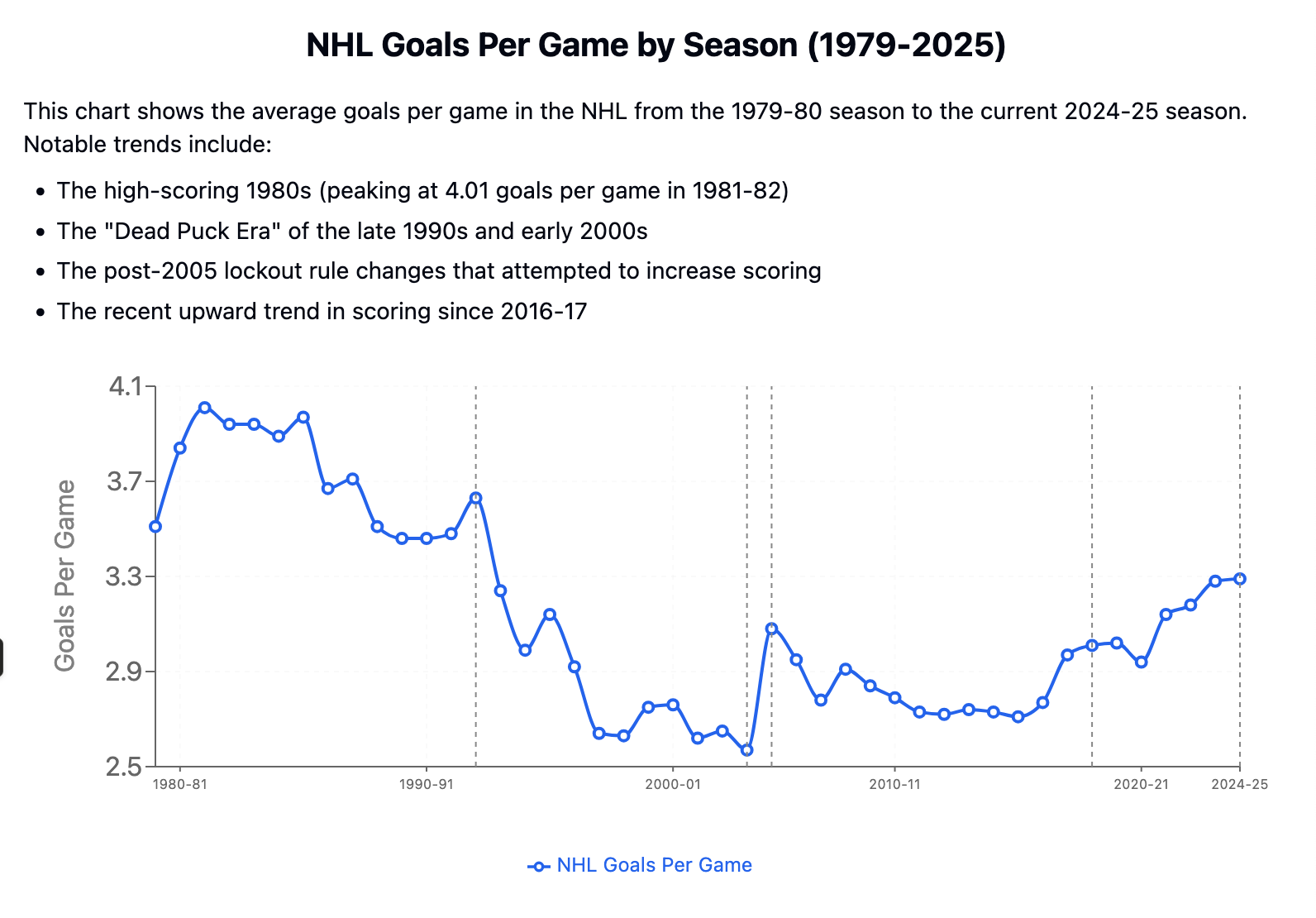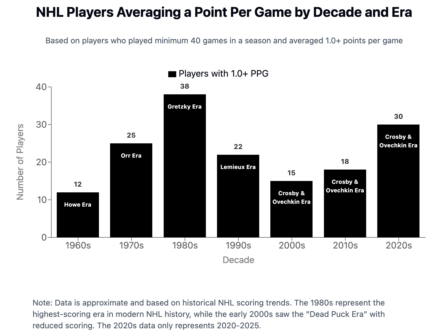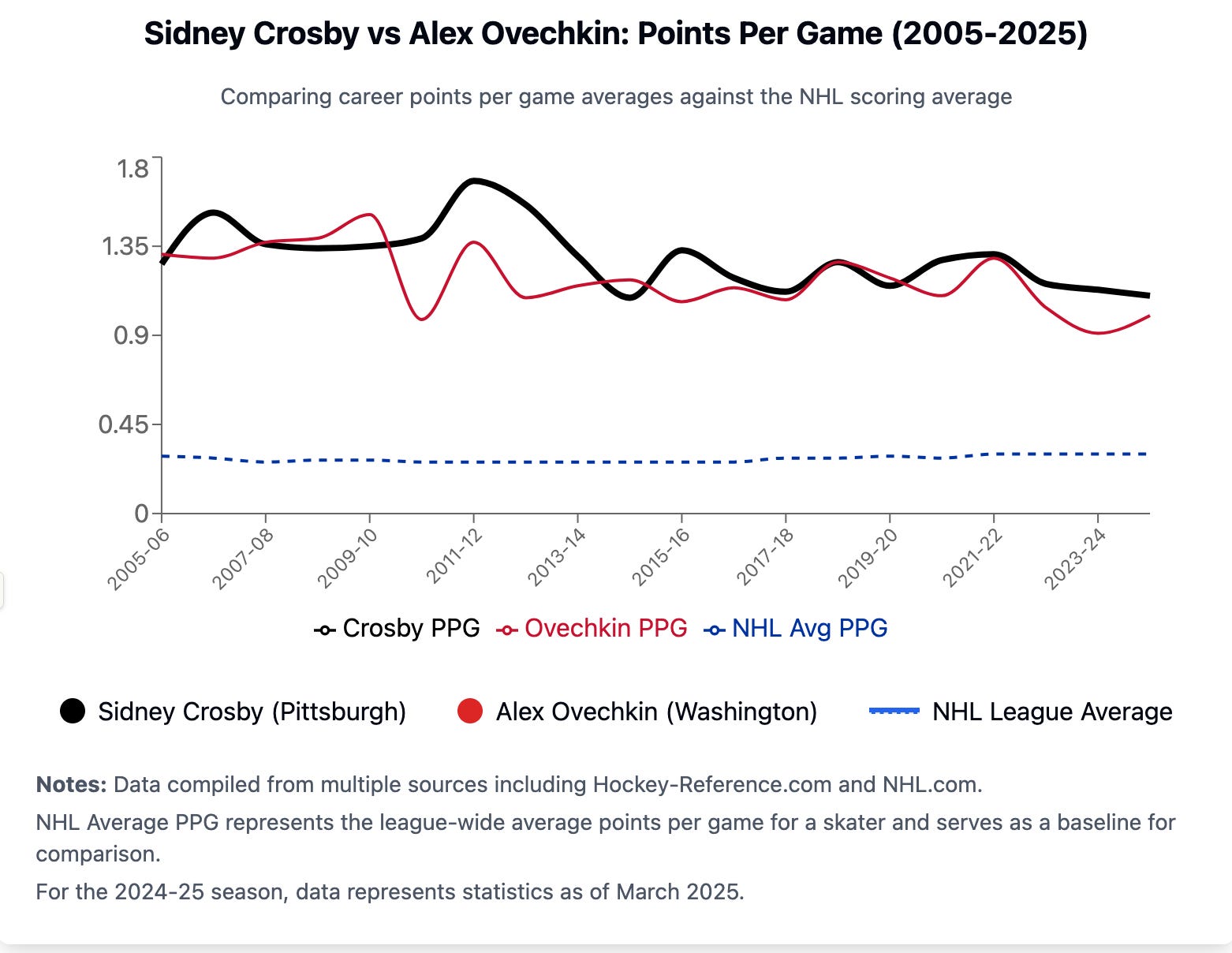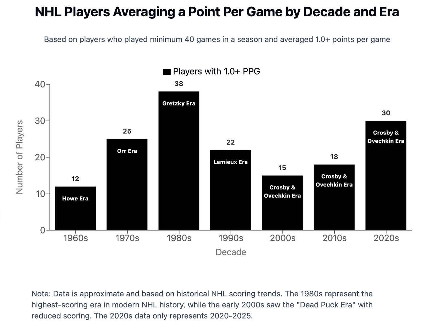The majority of Gretzky and Lemieux’s careers were spent in an era where NHL scoring hovered around 3.8 goals per game - compared to Crosby and Ovechkin’s whose career average has been roughly around 3.0 goals per game - almost a full goal per game lower relative to the years when Wayne and Mario were at their peak. Another example of this, is just how many players in the league at the time ALSO averaged a point per game (scoring either a goal or an assist during the game = 1 point). In the 1980’s (The Gretzky era) - a whopping 38 other players averaged over a point per game. Yes Wayne’s scoring was prolific - but so was the entire leagues. Meanwhile, during the prime years of Crosby’s career - the 2000s and 2010s - only 15 - 18 other players also averaged a point per game. That is an whopping difference of 20 players who also averaged a point in every single game for an entire season.