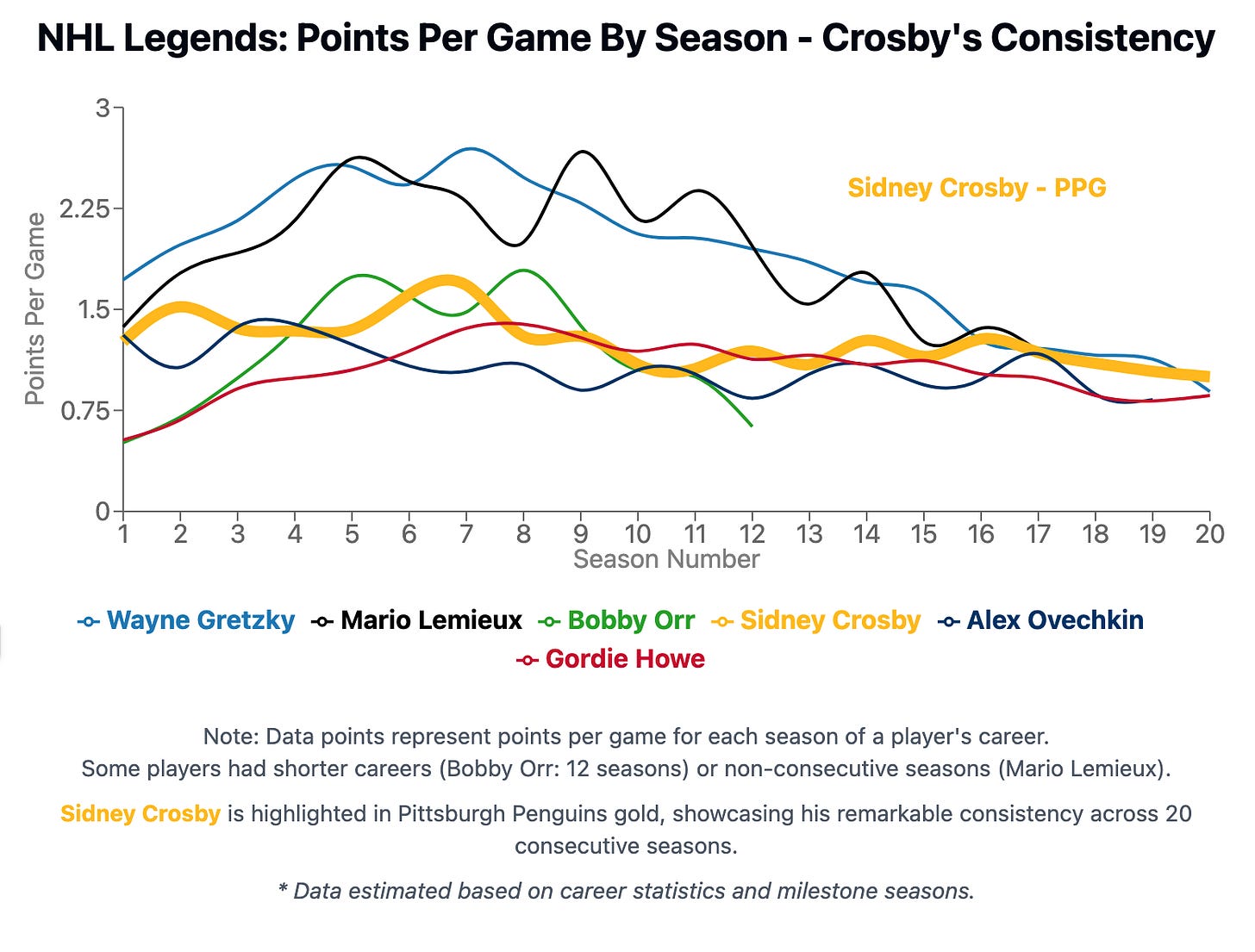 To put Crosby’s career scoring in context, the above shows just how remarkably consistent the Nova Scotian native has been throughout this career. While Lemieux and Gretzky had ridicolous highs that will never be touched again in the sport, both of their later career years trailed off significantly (due to injuries in Lemieux’s case, and natural aging in Gretzky’s). What is making Crosby and Ovechkin’s current seasons even more remarkable is how consistently productive both continue to be at ages 37 and 39 years old. Bringing it back to Crosby however, the graph makes it clear how smooth and less volatile Crosby’s production has been when comparing it to other legends careers: Gordie Howe, Gretzky, Lemieux, Bobby Orr, and Ovechkin. Its also worth appreciating just how dominant Crosby and Ovechkin have been for 20 seasons relative to the rest of the league.
